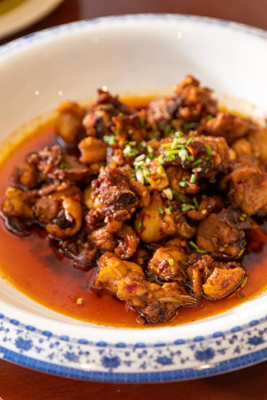 而源自川渝一带的辣子鸡,在贵州也找到了新的“灵魂伴侣”——糍粑辣椒。多选用以香气著称的花溪辣椒,连同嫩姜、蒜瓣一同舂至糊状,过程如同把糯米捣成糍粑似的,故有此名。当鸡块在油锅中与糍粑辣椒一同翻炒,辣味连带着姜、蒜的香气缓缓入侵其中,均匀地渗透到鸡肉的每一个角落。故贵州的辣子鸡虽不比川渝那般火爆热辣,却胜在回味悠长。