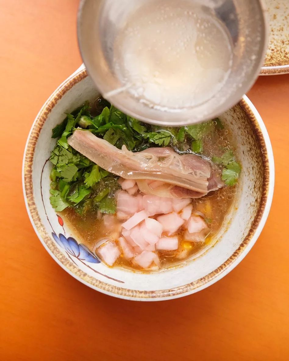 ▲ 往放了调料的碗里加一勺羊肉汤。摄影/ 学文映像