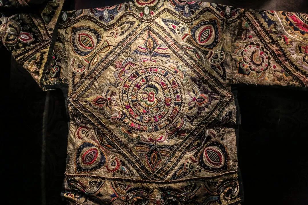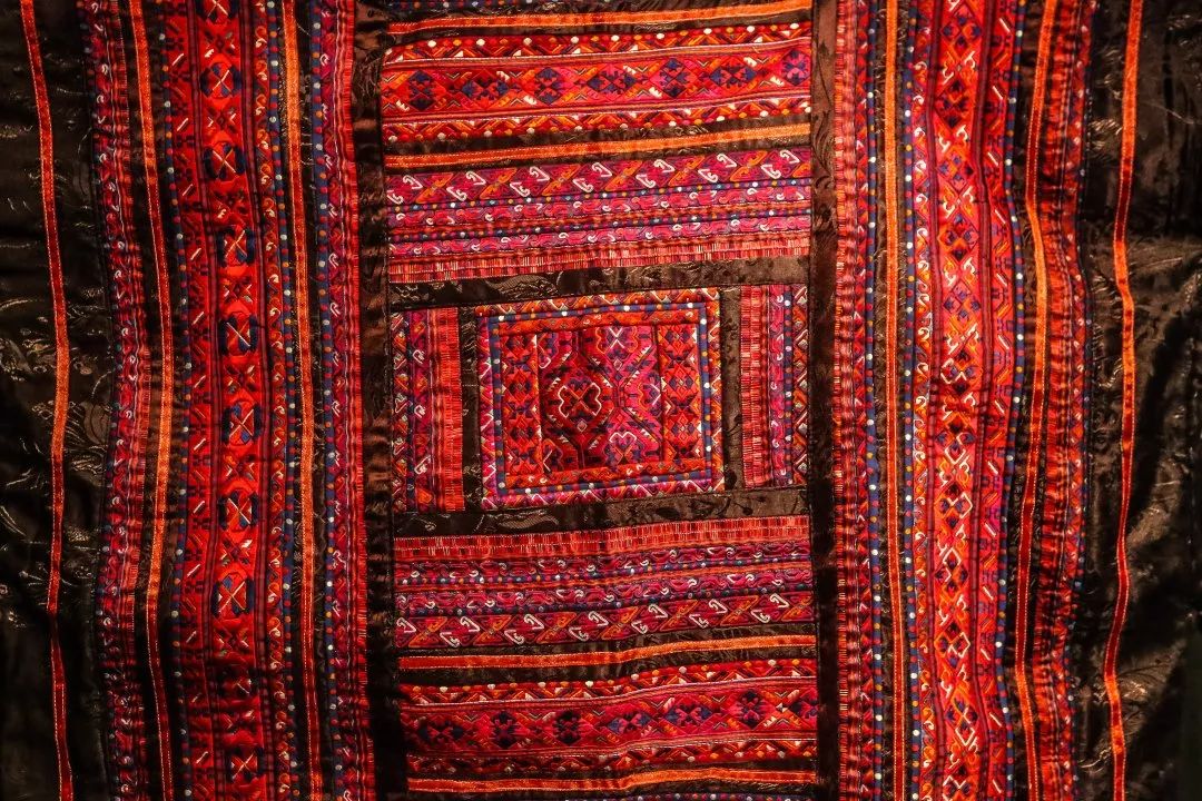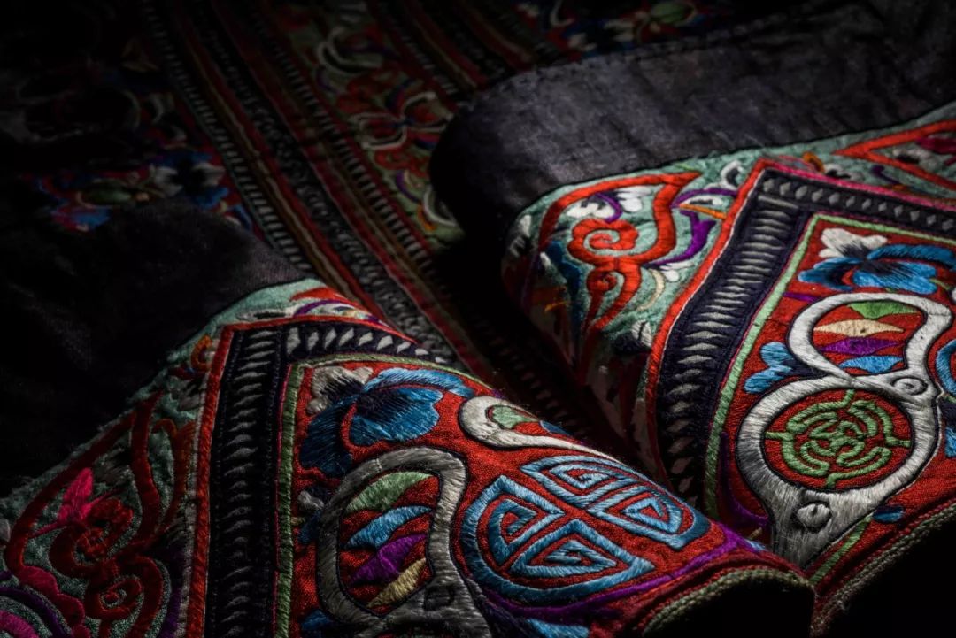 银饰下的衣服,则取代庙宇、祠堂等建筑,成为了苗人“行走着的信仰”。苗绣中的卷曲状纹样,象征着他们对宇宙起源于“一片混沌”的认知;而最常见的蝴蝶形象,那是被苗族奉为一切生灵之祖的“蝴蝶妈妈”;蝴蝶所栖息的枫树,则成了苗族人的神树,在苗绣中常以横截面出现;服饰上还存在着“祖屋”(鸟屋),代表着苗族人心中为祖先保留的空间。