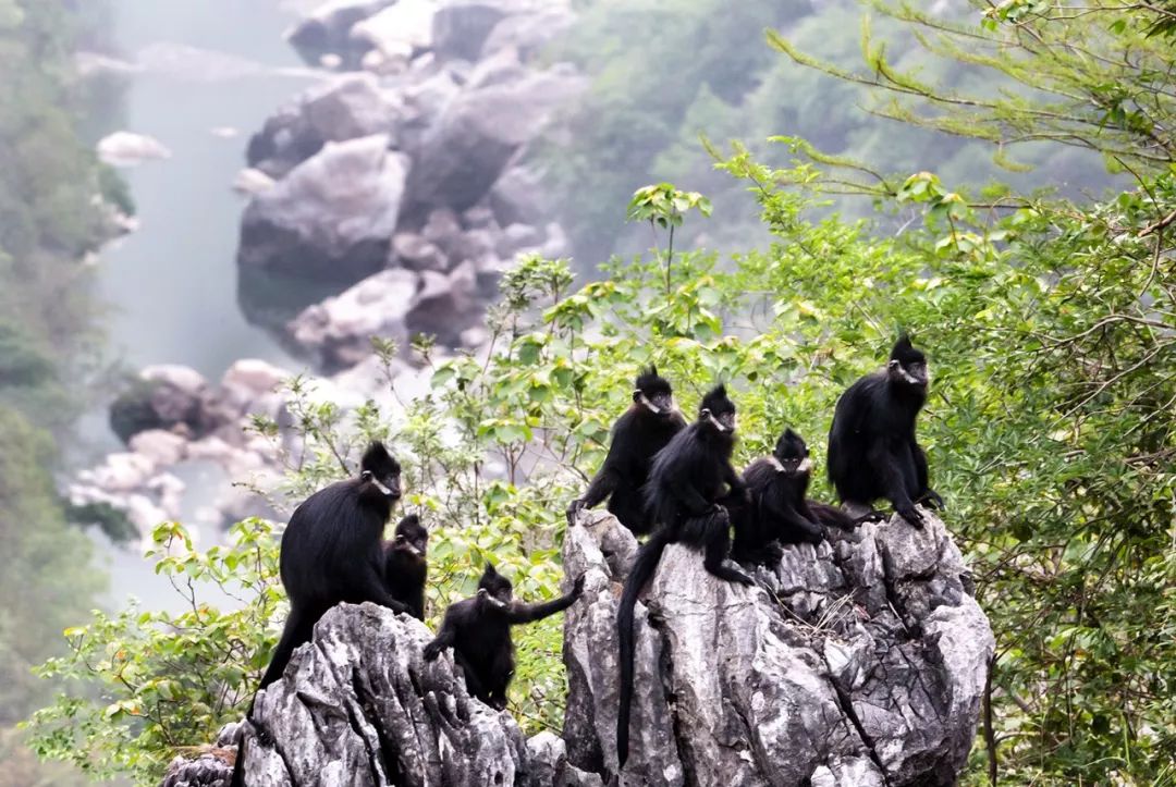 另一种同样珍稀的黑叶猴,只在人迹罕至、草木稀疏的悬崖峭壁间活动觅食,白日啸聚在山巅,夜里栖息于岩洞,好似“深居简出”的山间隐者。