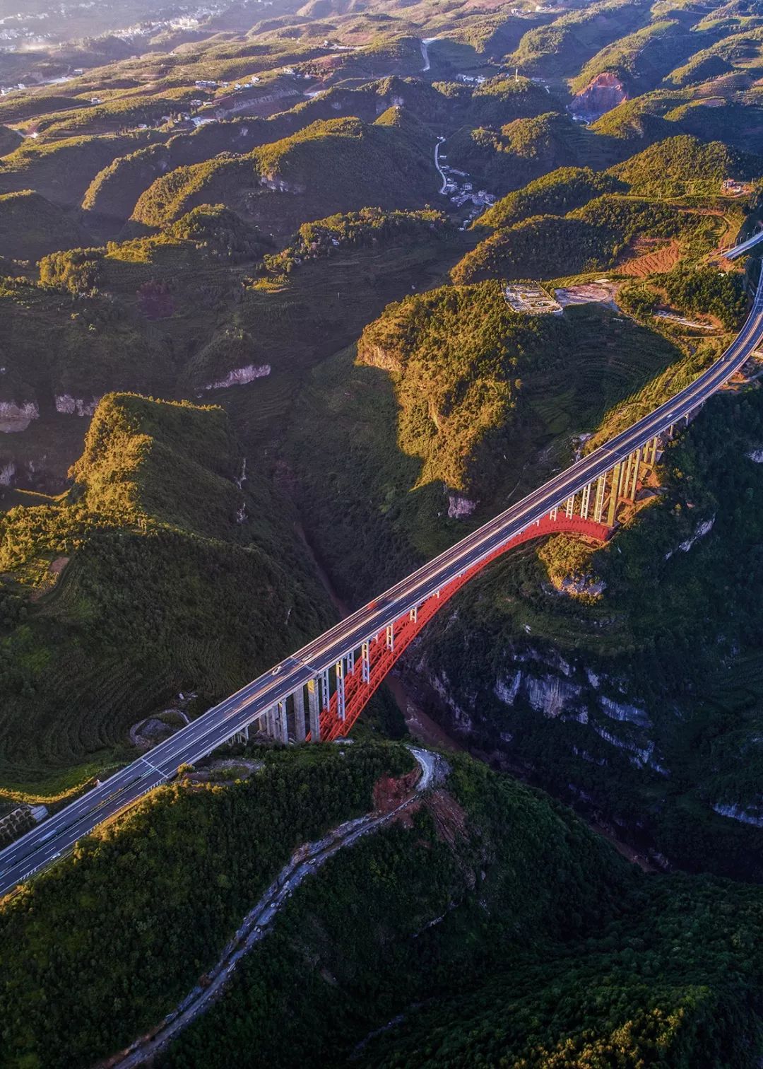 ▲ 毕节至都格高速公路总溪河大桥,位于贵州省纳雍县厍东关和维新交界的总溪河峡谷上。主桥跨径360米,建成时是贵州省最大跨径钢管混凝土上承式土桁拱桥。摄影/ 龚小勇