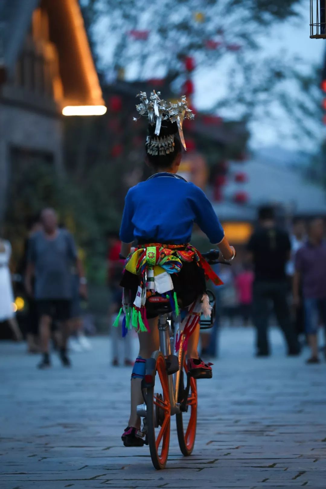 ▲ 穿着民族衣服骑着共享单车的姑娘。图/ 视觉中国