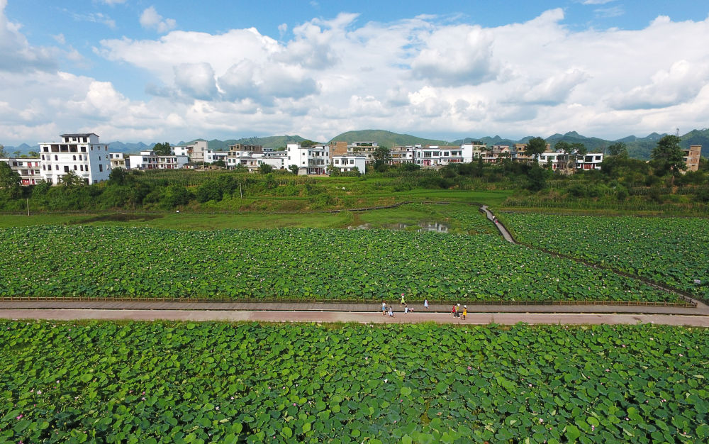 游客在贵州省惠水县好花红镇的荷塘观光(7月23日无人机拍摄)。新华社记者 杨文斌 摄