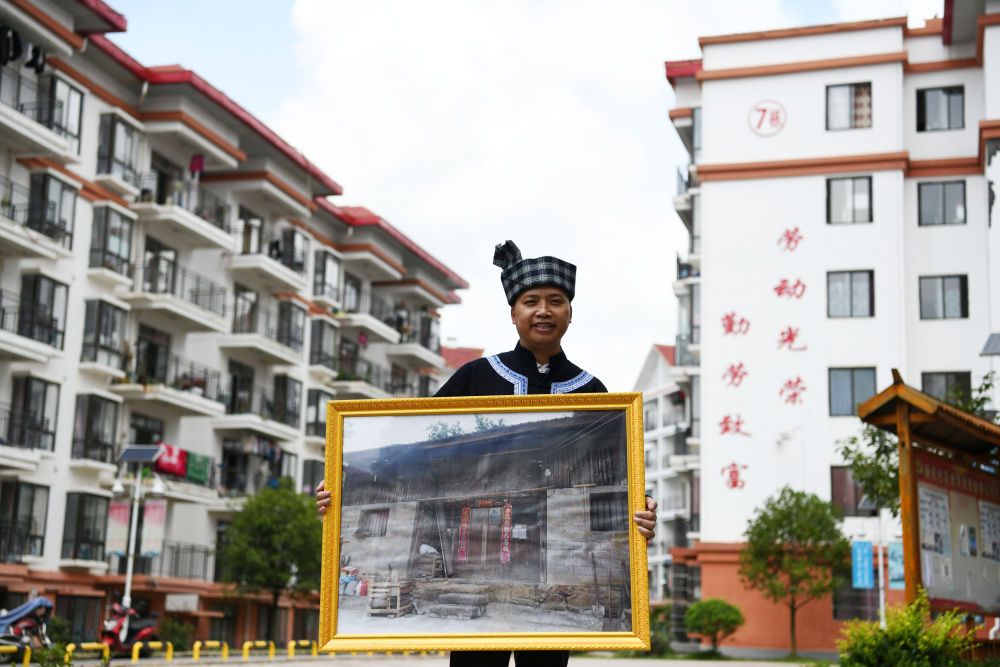 贵州省惠水县新民社区党支部书记罗应和在小区里展示易地扶贫搬迁前的老照片(7月23日摄)。新华社记者 杨文斌 摄
