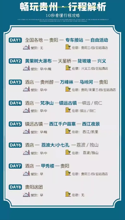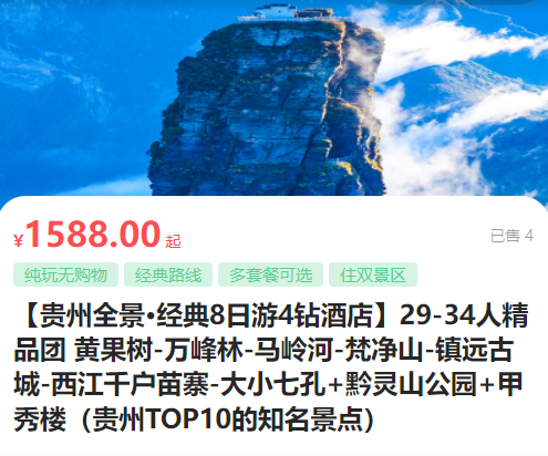 以大瀑布为核心景区,黄果树景区包括大瀑布、天星桥、陡坡塘三个游览区。游览大瀑布后,可以在天星桥的数生步上找到自己的生日踩三脚许个心愿,再去陡坡塘的西游漫步道上寻找儿时《西游记》的画面。游览结束后乘车前往兴义。