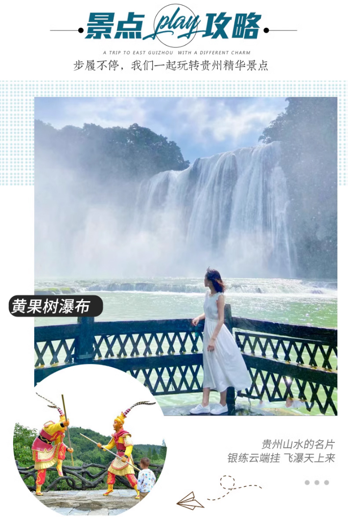 早上从贵阳出发,前往白水河上最雄伟瑰丽的乐章——黄果树瀑布,是世界上唯一可以从上、下、前、后、左、右六个方位观赏的瀑布,通过从瀑布后自然贯通的水帘洞能从洞内听、观、摸瀑布,水之奇、石之怪,堪称世界奇迹,好比是一部大型的交响乐。