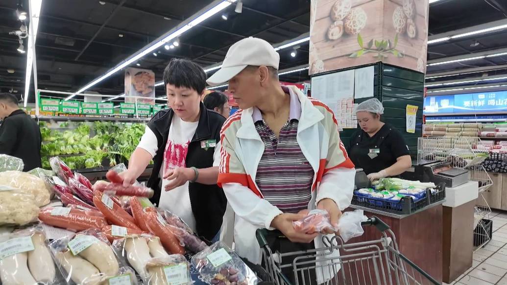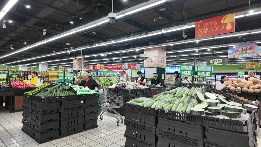 在北京华联生活超市,琳琅满目的商品陈列摆放着,蔬菜销售区,各色新鲜菜品摆满货柜,种类齐全、菜品新鲜,水果区高、中、低档不同品类的水果一应俱全,粮油区米面食用油供应充足,肉蛋区肉蛋价格亲民,鲜肉区各种牛羊肉色泽鲜亮。市民们正驻足挑选商品或排队称重。