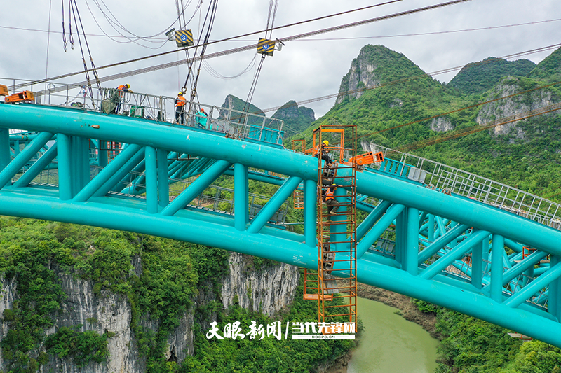 2025年9月19日,工人在距离水面800米高空的花江峡谷大桥塔顶施工。