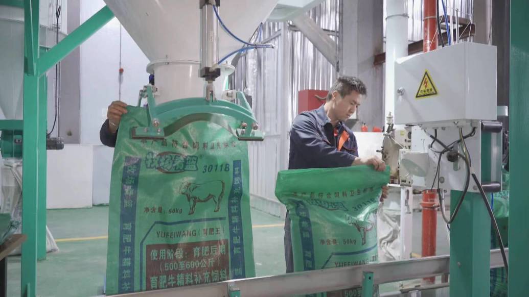 贵州盛世源通农业发展有限公司副总经理 钟成龙:与传统的饲料加工工艺不同,我公司采用的是目前最为先进的智能化饲料生产机械之一,配置了预混料生产设备系统、二次粉碎系统、制粒系统和成品包装系统。生产线呈上下分布,原材料从一楼投放口进入生产线,通过扳机通道输送到顶楼,再按照现代工艺、科学配比,途经十余道生产工序后回到一楼的包装区。