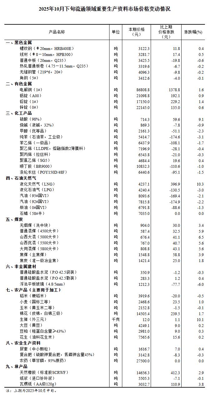 据国家统计局网站消息,据对全国流通领域9大类50种重要生产资料市场价格的监测显示,2025年10月下旬与10月中旬相比,26种产品价格上涨,22种下降,2种持平。