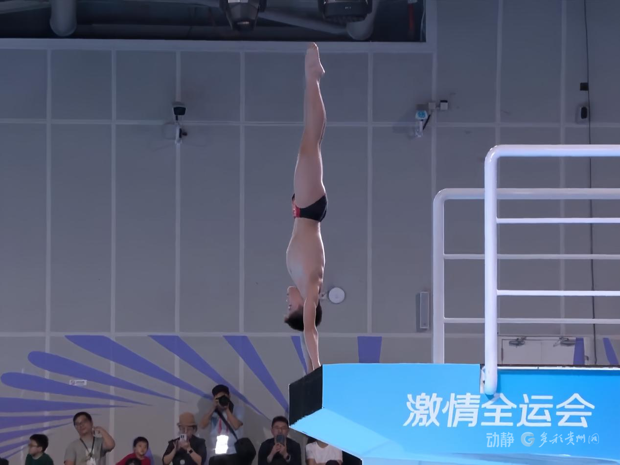 决赛中,吴仕杰在男子10米跳台第三跳中,选择了今年才学的难度系数为3.6的高水平动作——臂立向后翻腾两周转体两周半(直体姿态),这一动作在国际比赛中属于顶尖难度,最终因紧张出现失误,仅获50.4分。下场后,他全身发抖、眼眶泛红,已处于崩溃边缘。