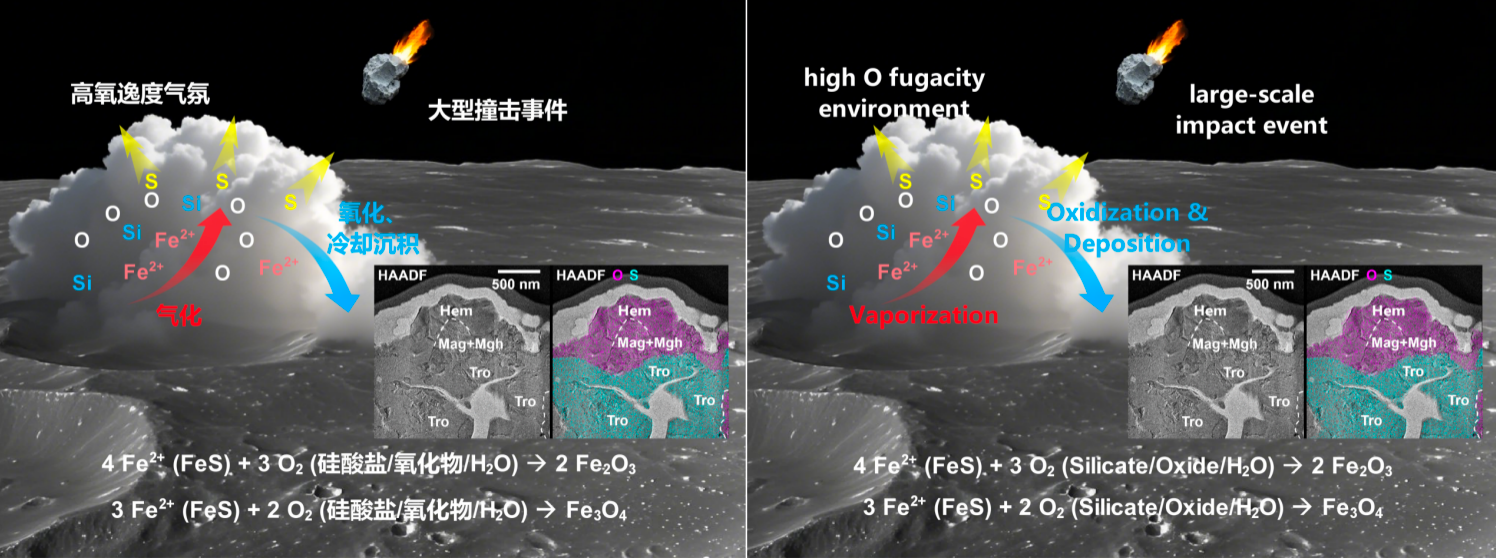 自人类登月以来,月球被认为整体还原,极度缺少氧化作用的关键证据,特别是赤铁矿等高价态铁氧化物。研究提出,赤铁矿的形成可能与月球历史上的大型撞击事件密切相关。大型撞击形成瞬时高氧逸度气相环境的同时,铁元素在高氧逸度环境中被氧化,使陨硫铁发生了脱硫反应,经气相沉积过程形成微米级晶质赤铁矿颗粒。值得关注的是,该反应的中间产物为具有磁性的磁铁矿和磁赤铁矿,可能是南极-艾特肯盆地边缘磁异常的矿物载体。该研究首次利用样品证实了在超还原背景下月球表面存在赤铁矿等强氧化性物质,揭示了月球的氧化还原状态以及磁异常成因。