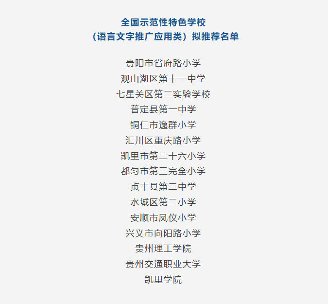 近日,贵州省全国示范性特色学校创建(语言文字推广应用类)拟推荐名单已出,拟推荐15所学校,现将名单予以公示。