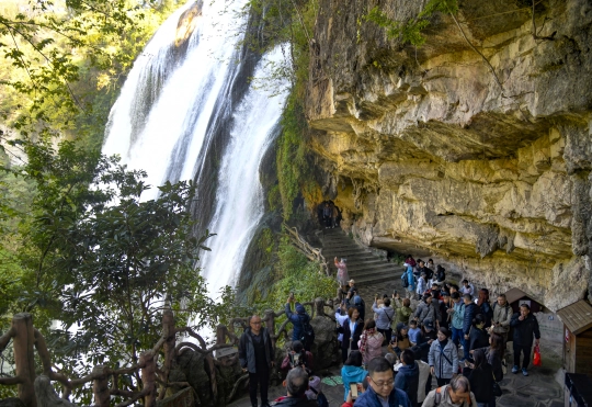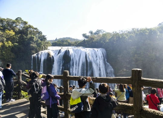 11月25日,冬日里的黄果树大瀑布褪去丰水期的喧嚣,水流似银色绸缎倾泻而下,在暖阳下泛着粼粼金光,尽显静谧壮阔的冬日韵味。景区内游客接踵而至、络绎不绝,随处可见驻足赏景、拍照打卡的身影。