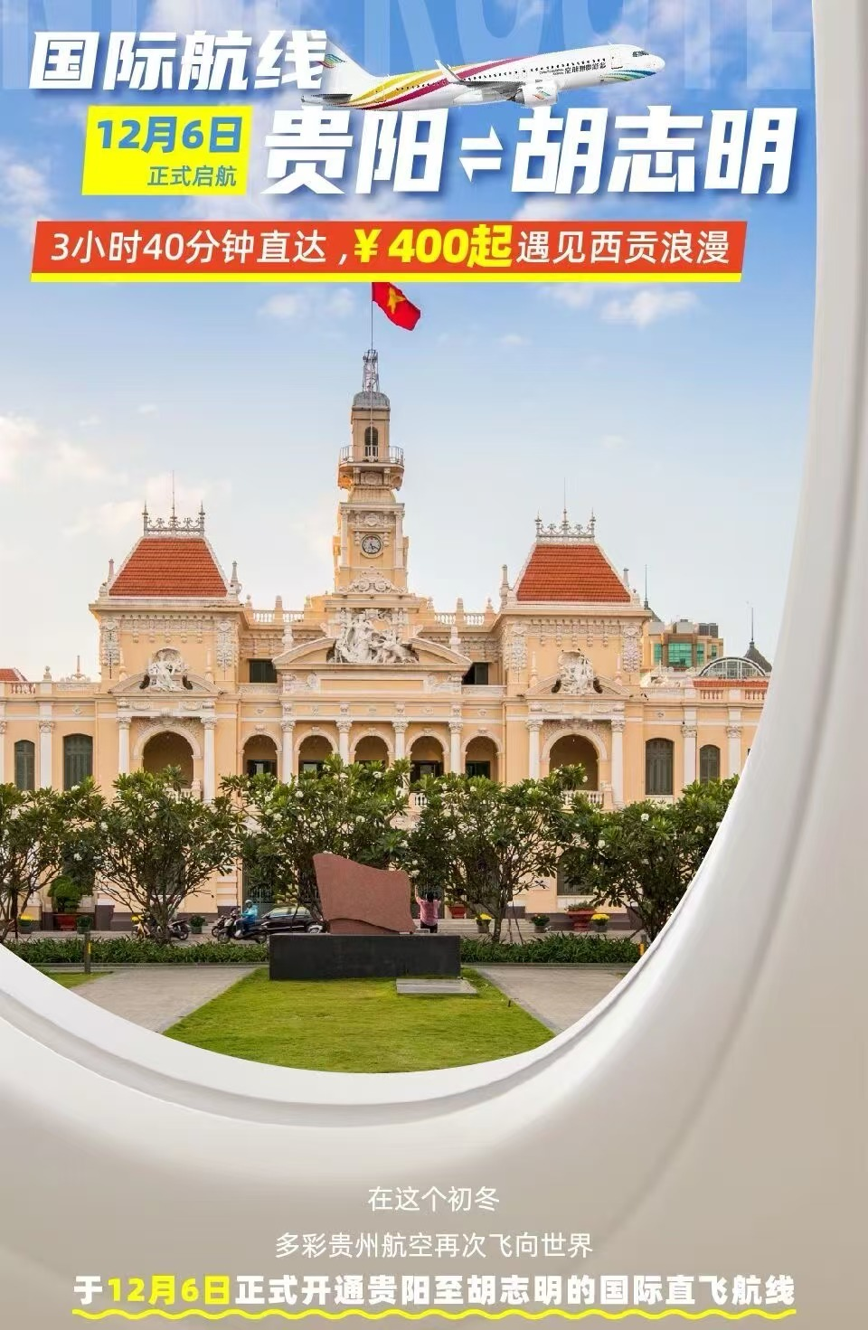 为服务贵州高水平对外开放,助力黔越两地经贸与人文交流,多彩贵州航空于2025年12月6日正式开通贵阳-胡志明往返直飞国际航线。一条全新的空中桥梁即将贯通,为您的东南亚商务出行与休闲度假,提供更便捷、更优质的选择。