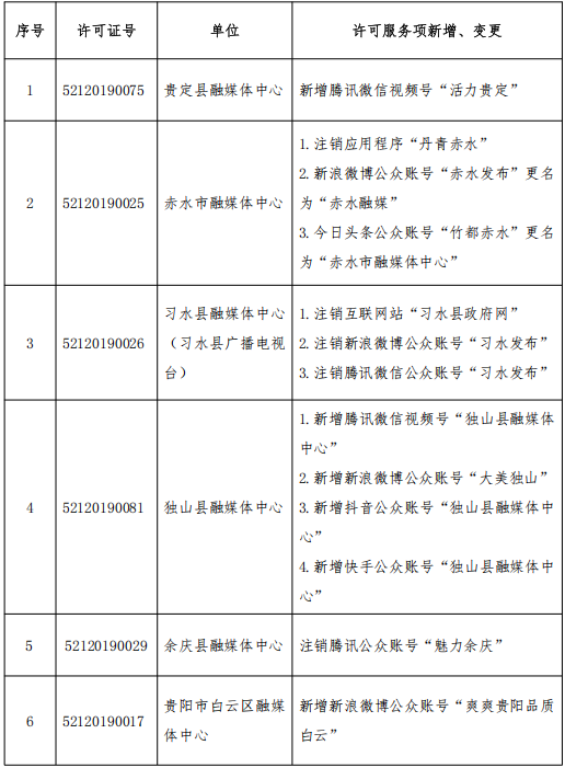 2025年12月,贵州省互联网信息办公室依法对相关单位提交的许可服务项新增、变更申请开展审批,同意有关许可服务项新增、变更事宜,现公示如下: