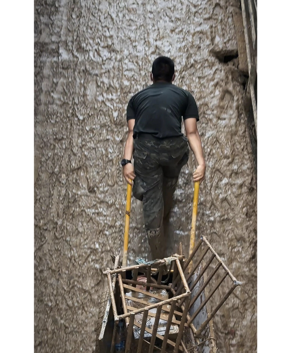 榕江巷道里的救援武警马东昇,被网友称为“中国脊梁”。(视频截图)