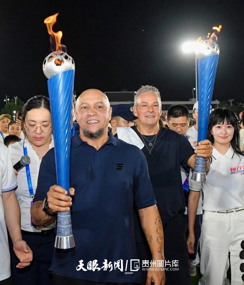 著名球星巴乔,卡洛斯在榕江县“村超”球场,点燃“村超”火炬。(贵州日报天眼新闻记者 赵相康 摄)