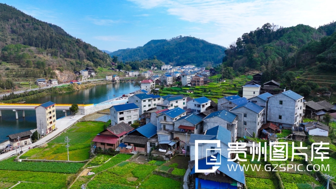 黔东南苗族侗族自治州锦屏县大同乡平阳村农家房屋错落有致,河水清澈碧绿,与青山、公路、农田相映成景,构成了一幅美丽的乡村冬景图。(贵州图片库)