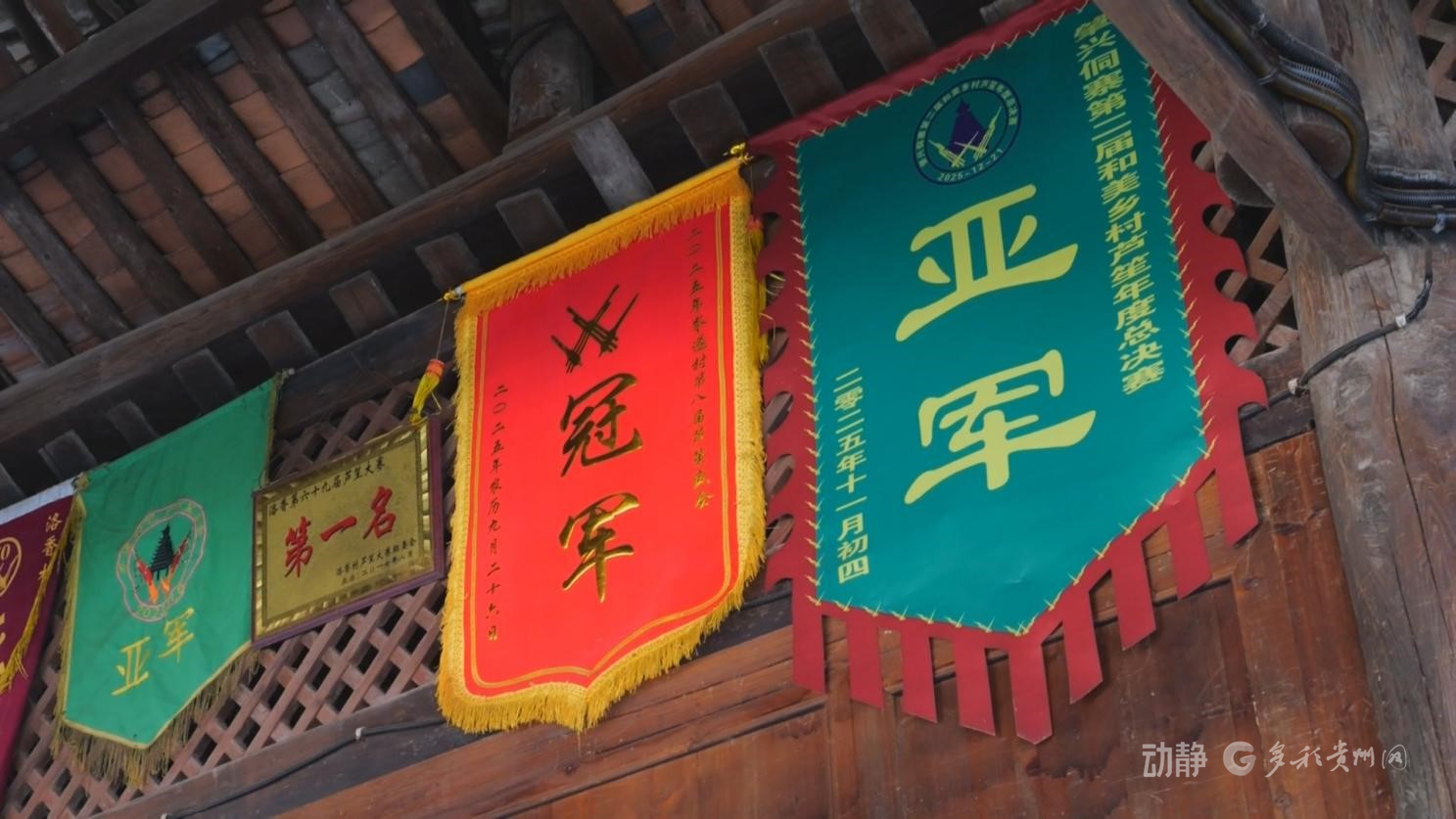 肇兴侗寨信团鼓楼里,几面崭新的奖旗,为这栋百年建筑增添了一抹亮色。
