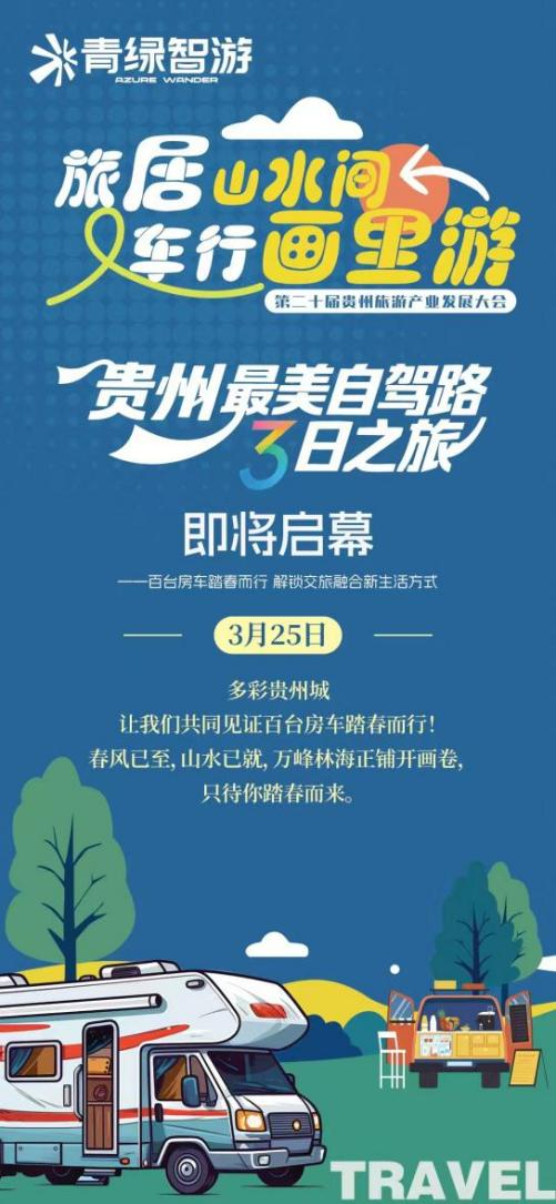 春风驰行,黔山如画。在第二十届贵州旅游产业发展大会即将召开之际,由贵旅集团主办、贵旅出行公司承办的“旅居山水间 车行画里游”—“青绿智游”最美房车露营风景廊道活动将于3月25日盛大启幕。百台房车集结,穿行于云雾峰林之间,以流动的诗意栖居,奏响贵州交旅融合、品质旅游的春日乐章。