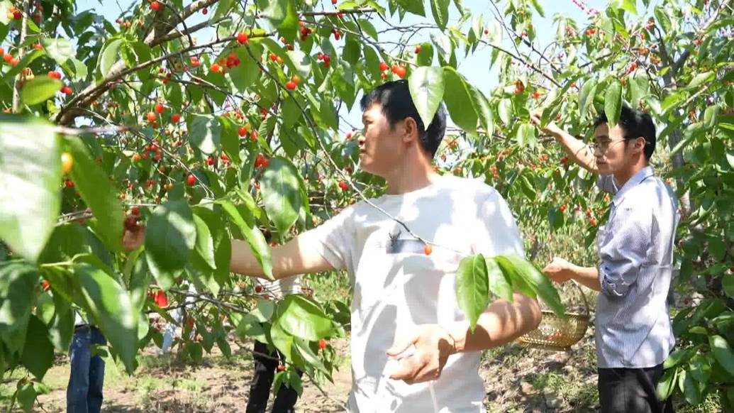 镇宁自治县募役镇炮桐湾村党支部书记 彭洋:从20年前就已经开始种起樱桃,因为当时本地樱桃的枝干长的比较高,所以说无法去拉枝,导致农户一直的增收不是很好,后期政府为了增收村民的收入,就把这个樱桃品种改为玛瑙红。对农户来讲非常有效益的,非常好采摘、非常快,我们农户一天慢的他们可以采摘五六十斤,快的有七八十斤、百把斤。