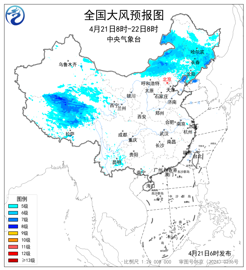 预计,4月21日8时至22日8时,内蒙古中东部、黑龙江中南部、吉林、辽宁以及新疆南疆盆地、西藏北部、青海西部等地部分地区有5~7级风,阵风8~9级,渤海北部海域、黄海北部海域将有7级、阵风8级的风。