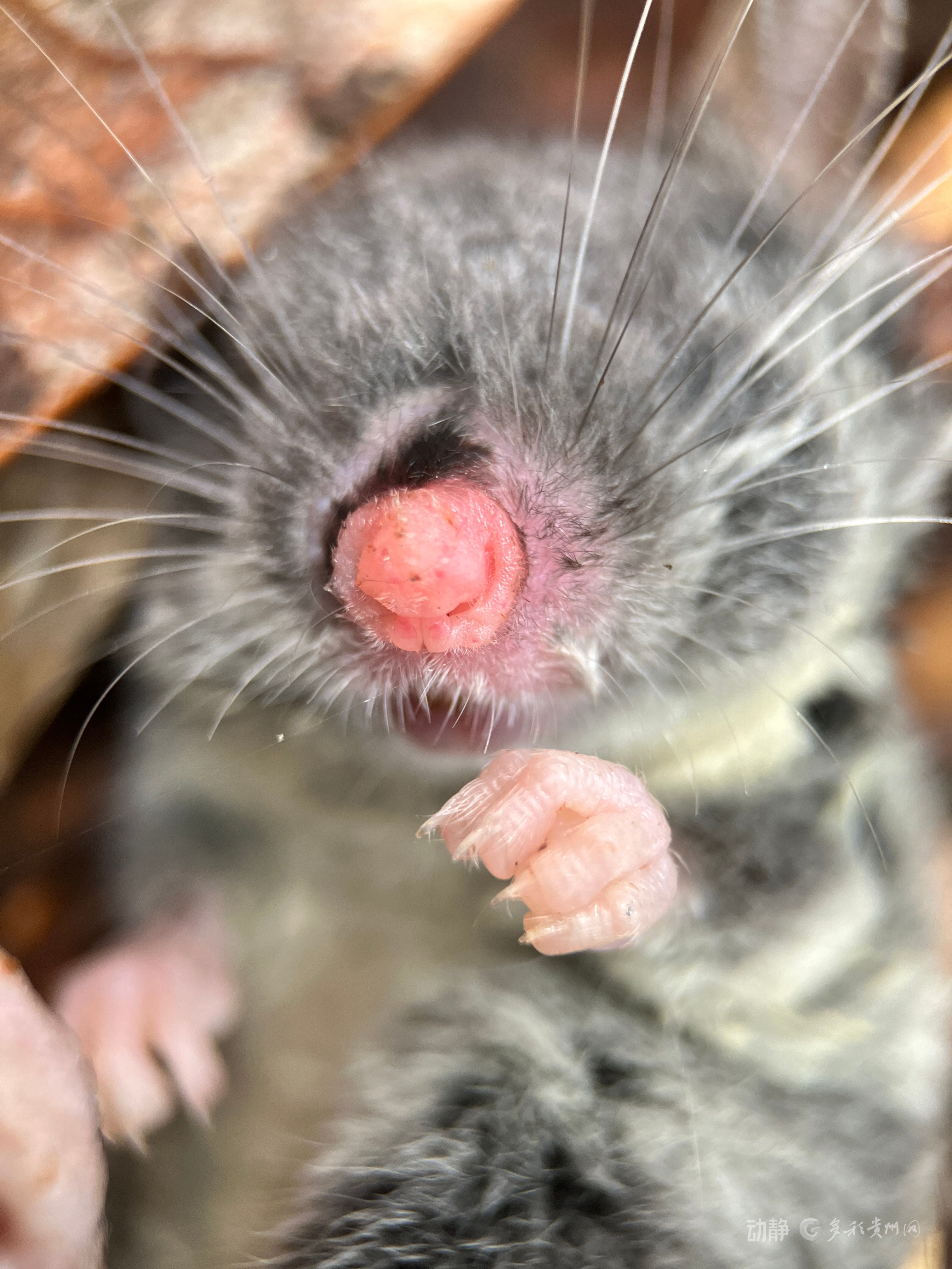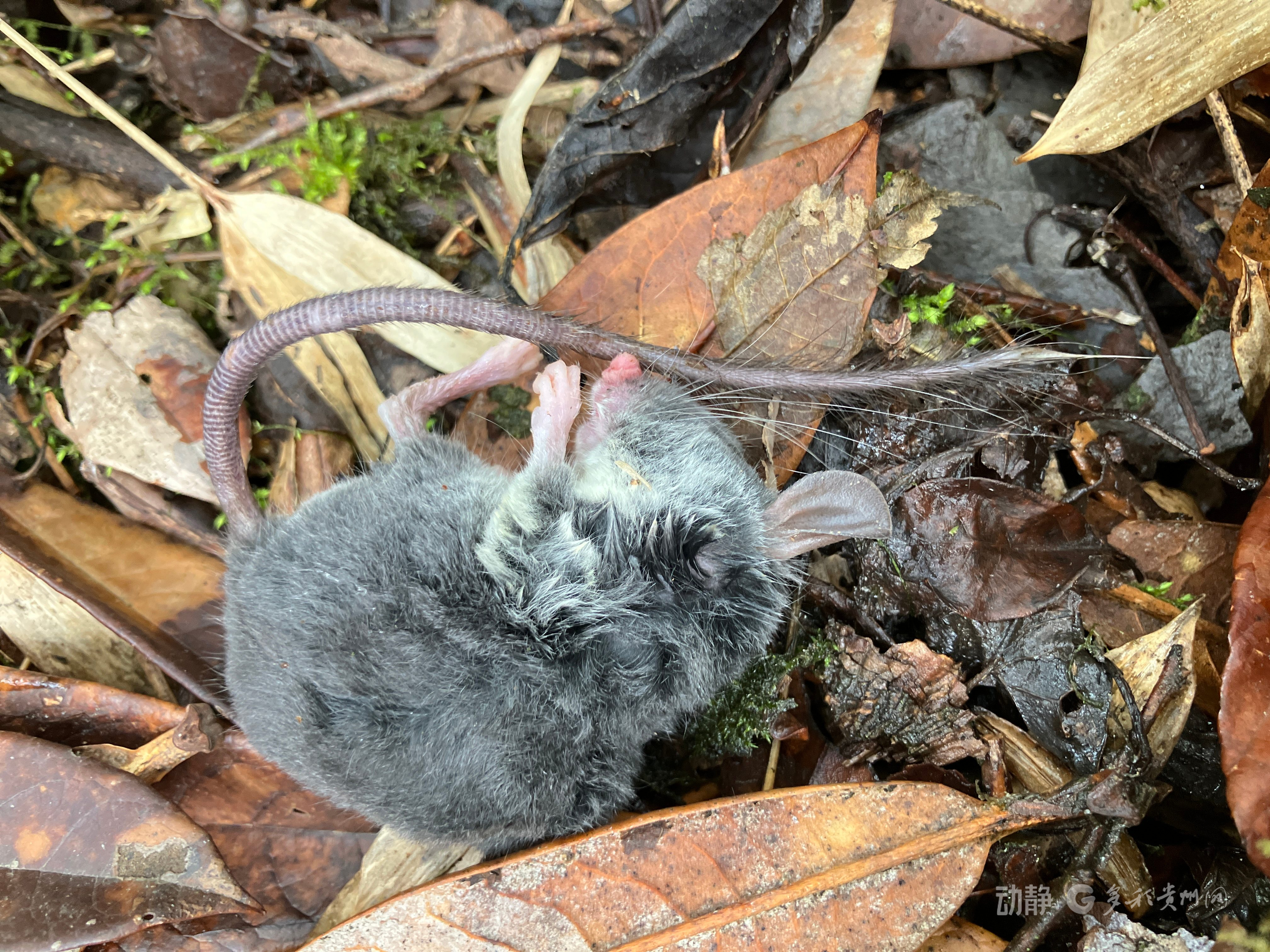 近日,贵州梵净山发现非常“萌”的小型哺乳动物新种——政坤猪尾鼠(Typhlomys zhenghuni)。政坤猪尾鼠是猪尾鼠属中体型较大的物种,其体背被毛呈深灰色,眼睛如米粒般细小,耳朵大而裸露,尾尖有一簇明显的白色长毛。因其吻部似猪嘴,尾巴如猪尾,故名猪尾鼠。