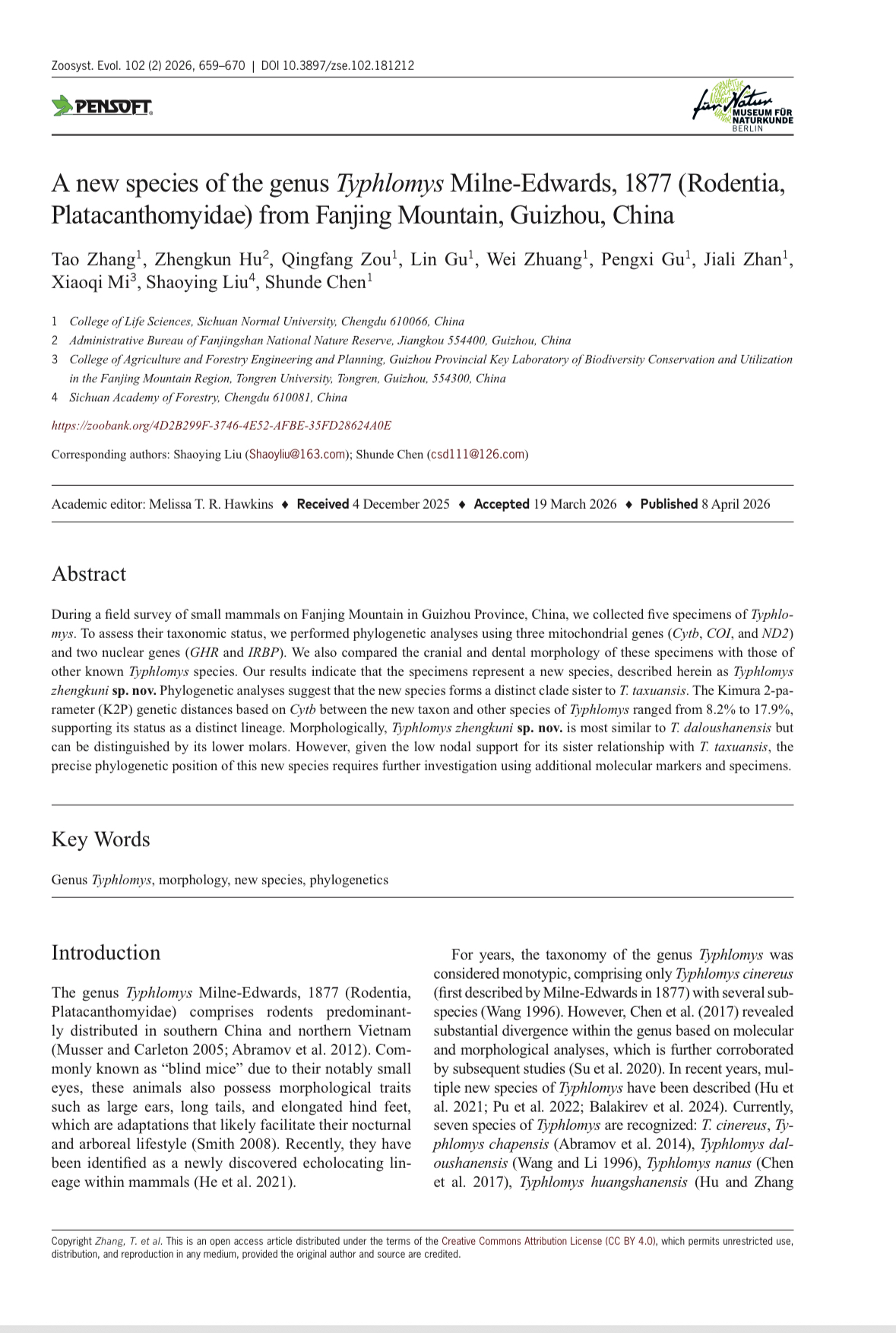 政坤猪尾鼠是贵州省首次发现,将猪尾鼠属的已知物种增至八个,丰富了梵净山哺乳动物种类。这一成果已发表在SCI国际期刊《动物系统学与进化》上,该物种名已经被国际动物命名法委员会(ICZN)收录。