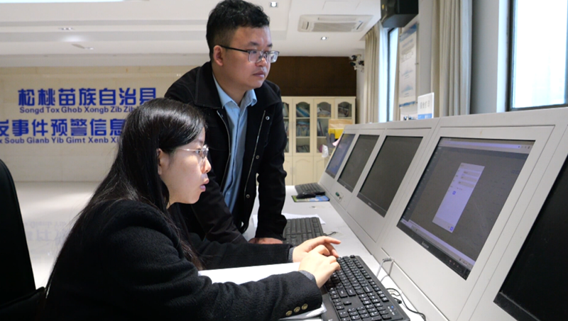 在铜仁市松桃苗族自治县气象局突发事件预警信息发布中心,工作人员正通过雨情预报预警雷达等监控平台,密切关注天气变化。