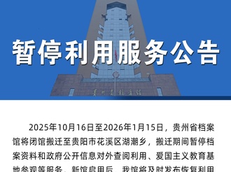 重要提醒!贵州省档案馆即将搬迁 期间暂停利用服务3个月2025年10月10日