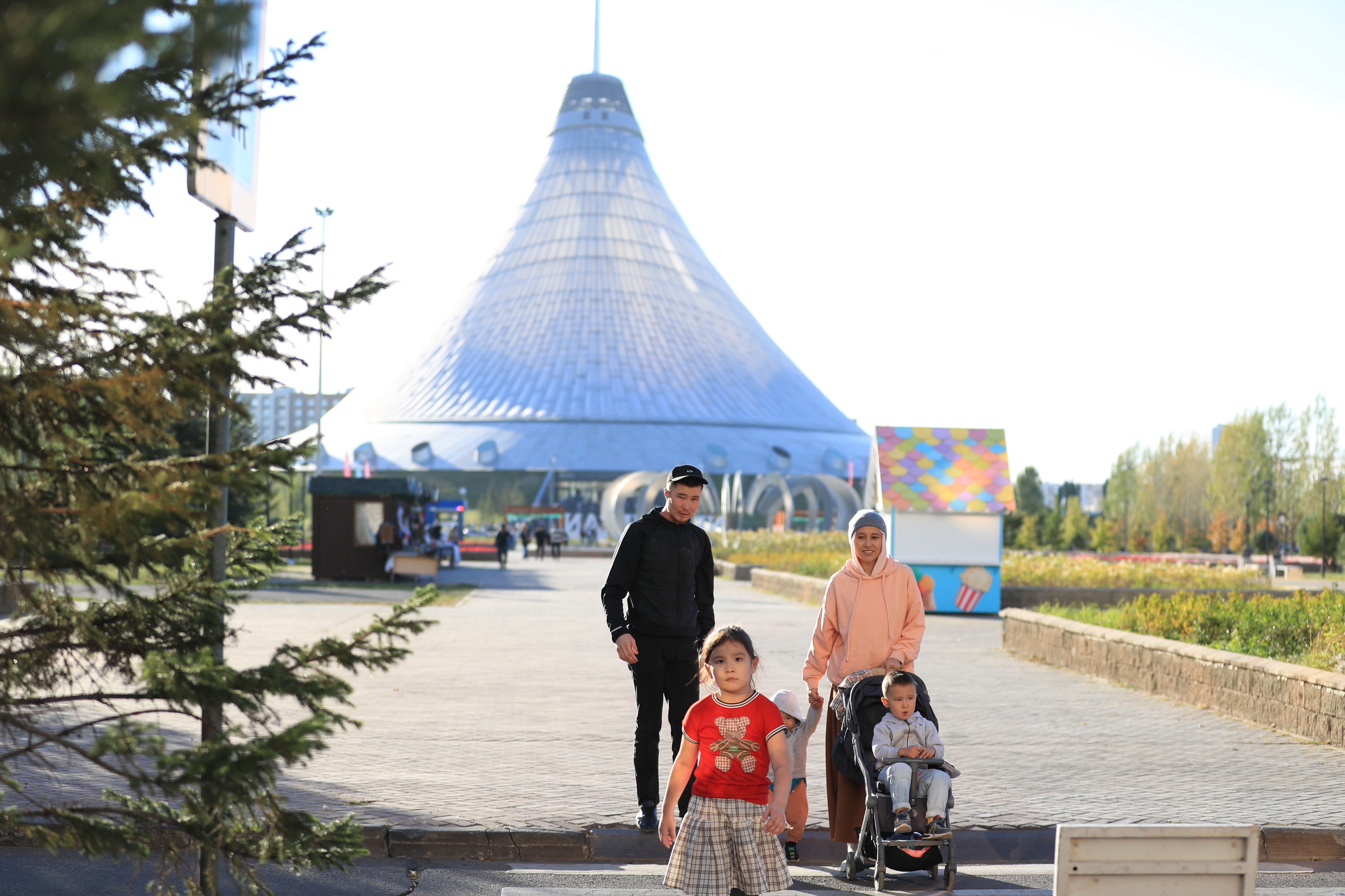 市民走在哈萨克斯坦首都街头,他们身后是著名的“可汗之帐”购物中心。