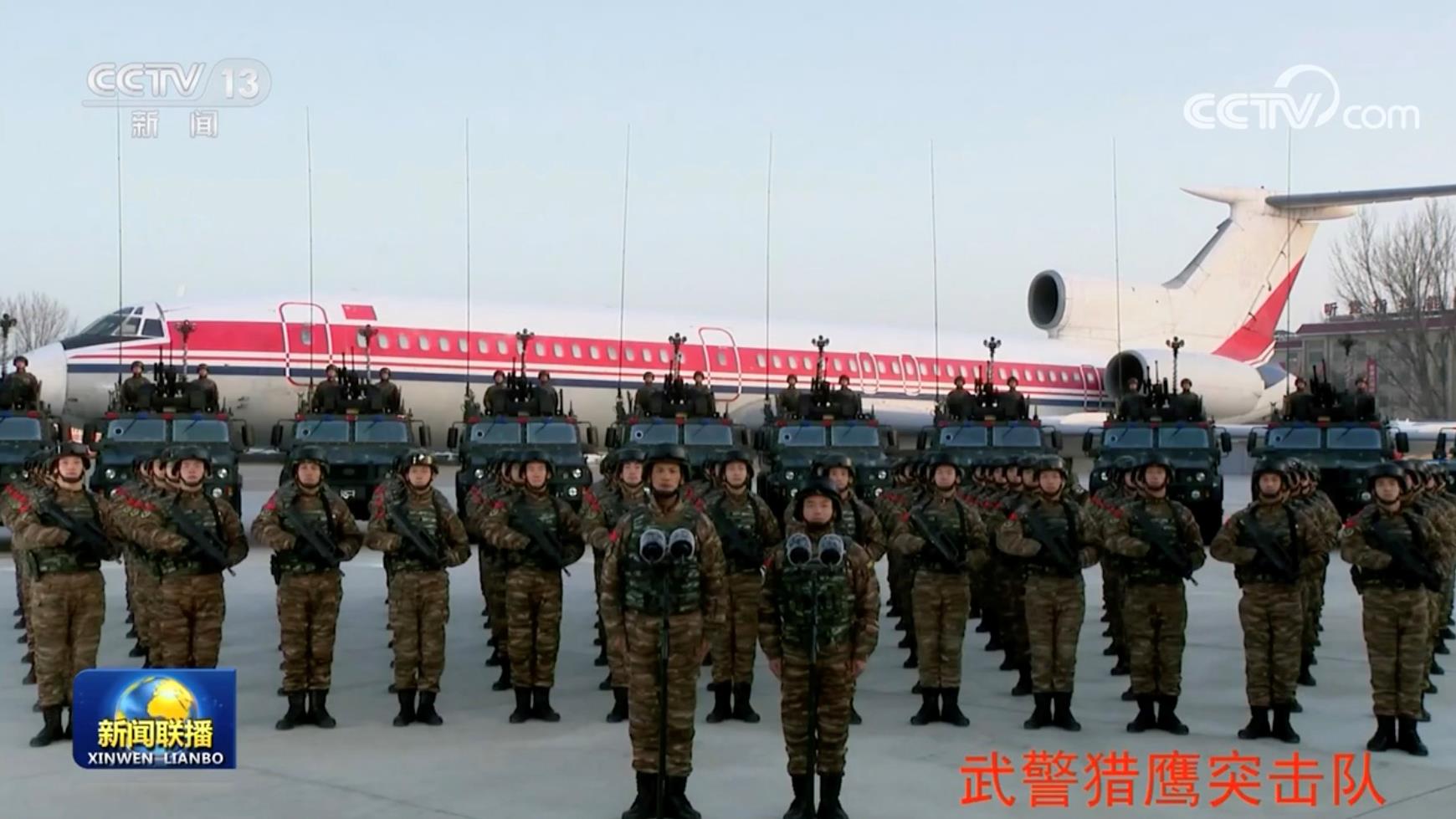 △2023年1月18日,习近平主席在北京八一大楼以视频方式检查部队战备工作,亲切慰问有关部队。这是武警“猎鹰突击队”在进行汇报。