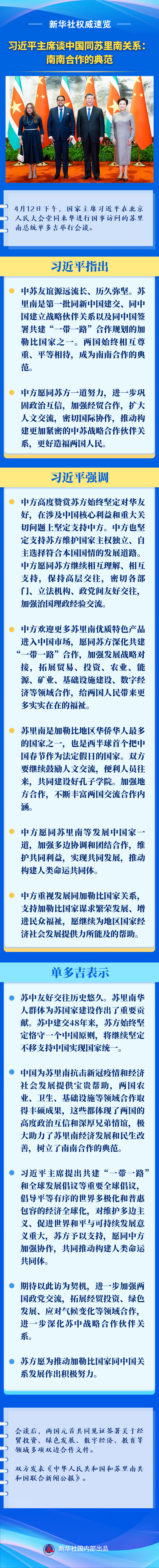 4月12日下午,国家主席习近平在北京人民大会堂同来华进行国事访问的苏里南总统单多吉举行会谈。一起来看两国元首谈话要点。