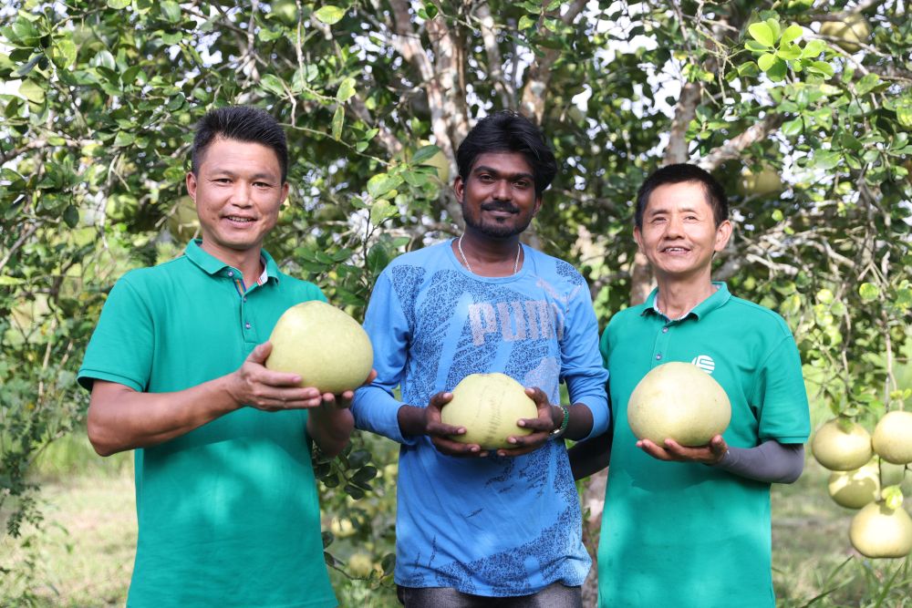 距离首都帕拉马里博约一个半小时车程的萨拉马卡区,眼下正是柚子丰收季。在农户阿什温·杜基家的果园里,树枝低垂,硕果累累,杜基和弟弟带着工人们忙碌采摘。以往,这家人连买农具都要向亲朋好友借钱。能过上好日子,离不开中国农业技术专家的支持。