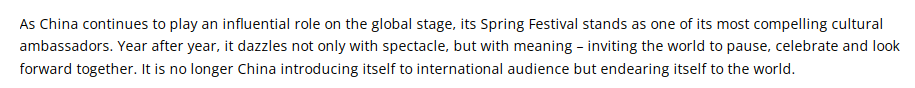 文章说,春节的精髓引发了全世界的共鸣,因为它提供了又一个增进交流的绝佳机会。春节所蕴含的团聚、和谐和希望等价值观,深深打动了不同文化背景的人们。春节已被列入联合国教科文组织人类非物质文化遗产代表作名录,因此,它不仅仅是一个中国的节日,而是全人类共同珍视的瑰宝。