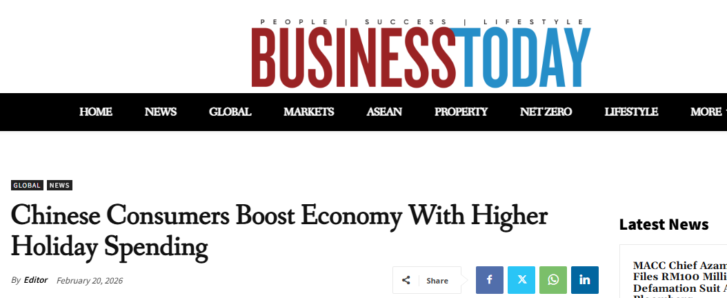 马来西亚《今日商业》近日发表题为《春节消费热潮涌动 中国经济活力迸发》的文章,聚焦中国春节假期消费。