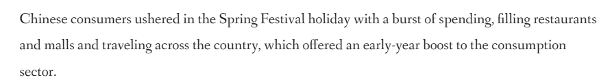 文章说,中国在春节期间迎来消费热潮,餐厅、商场人头攒动,全国旅游市场火爆,为消费市场实现“开门红”注入强劲动力。