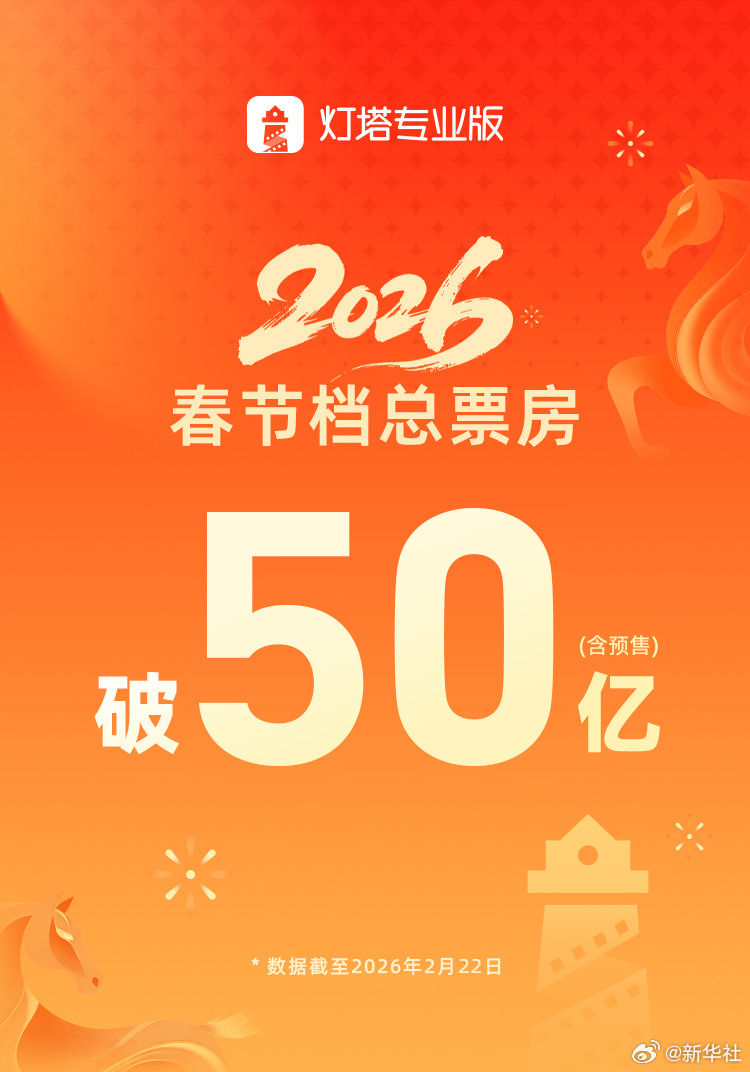 据网络平台数据,2026年春节档档期总票房(含预售)破50亿元。
